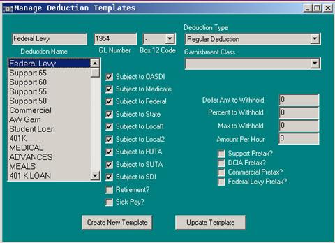 For new Deductions, type the name and click on "Create New Template" and select the attributes below. When finished, press "Update Existing".