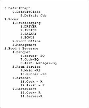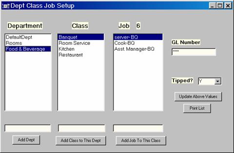 First, make a list of your company's departments, such as ROOMS, FOOD & BEVERAGE, etc. Then make a list of all of the job classifications in each department, such as HOUSEKEEPING, FRONT OFFICE, and MANAGEMENT in the Rooms Department. BANQUET, ROOM SERVICE, KITCHEN, RESTAURANT in the Food & Beverage Department. Then make a list of all job titles in each job classification, such as SERVER-BQ, COOK-BQ and ASSISTANT MANAGER-BQ.