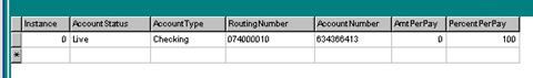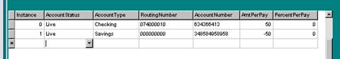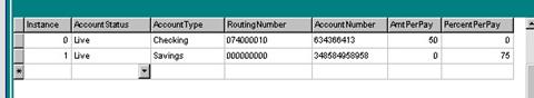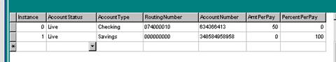 This grid allows you assign the necessary information to enable direct deposit for your employees. To save the values in a row, use the down arrow on your keyboard to go to the next row.