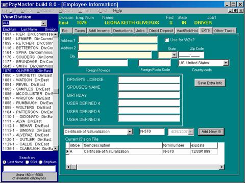 The lower section of the screen is for optional I9 tracking information. Select a type of I9 and click on "Add new I9". You may indicate a date to expire by entering the date and tabbing to the next row to save the changes. There is an I9 report that will show missing or expired I9s.