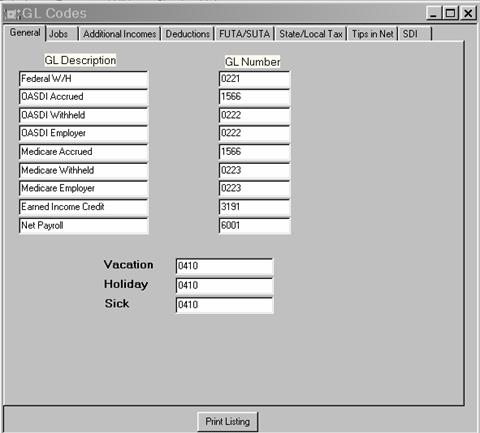 Most of the GL codes are previously entered when setting up the company, division, departments, class and jobs.