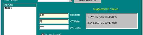 Next, with that job highlighted, enter the "Reg Rate" (regular wage), and then the OT Rate ( Overtime wage) and the "WC Code" ( Workman's Compensation Code) if applicable, otherwise you can keep the "****". For the wage, PayMaster will automatically show a pop-up screen for OT wage which is generally 1.5 times the regular rate, or in the case of tipped employees it is 1.5 times the minimum wage then subtracting out the tip credit. See below for example.